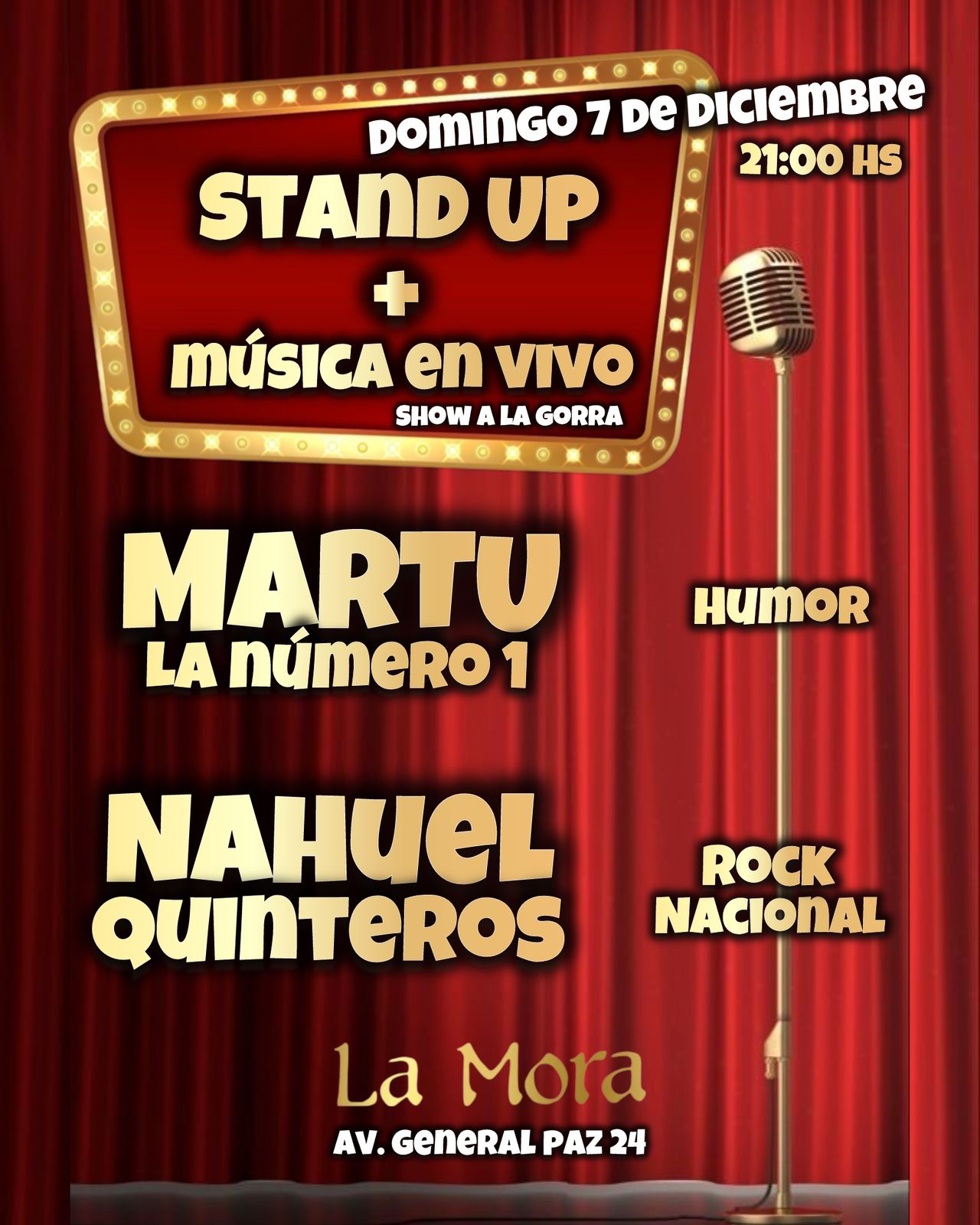 La presentación se realizará este mismo domingo, 7 de diciembre, en el Bar La Mora, ubicado en General Paz 24. Los asistentes pueden llegar a las 21:00 horas, mientras que el show dará comienzo a las 22:00 horas. La entrada al espectáculo es a la gorro, con una sugerencia de $5000 pesos, pero abierta a lo que cada asistente considere aportar.