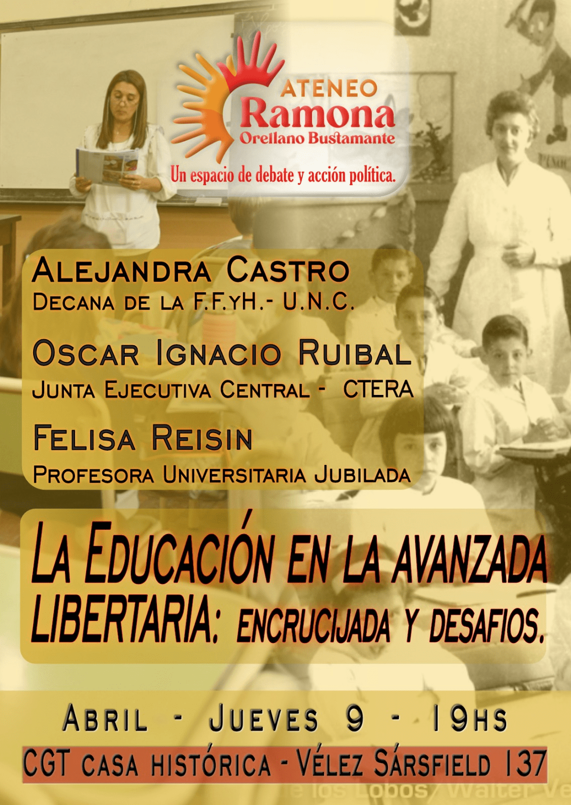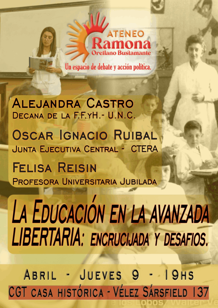 El encuentro contará con la participación de un panel integrado por la doctora en Ciencias de la Educación Alejandra Castro, decana de la Facultad de Filosofía y Humanidades de la Universidad Nacional de Córdoba; el dirigente sindical Oscar Ignacio Ruibal, integrante de la conducción nacional de CTERA; y la profesora universitaria jubilada Felisa Reisin.