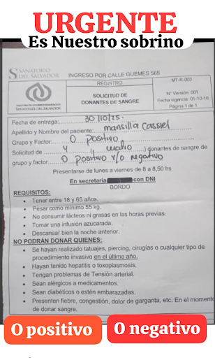 La familia de Casiel Mansilla, un joven de 19 años estudiante de Contaduría, ha lanzado un pedido desesperado a la comunidad para conseguir dos dadores de sangre de grupo cero (positivo o negativo). Casiel entró a cirugía de urgencia a las 8 de la mañana de hoy debido a un tumor detectado en el tronco cervical.